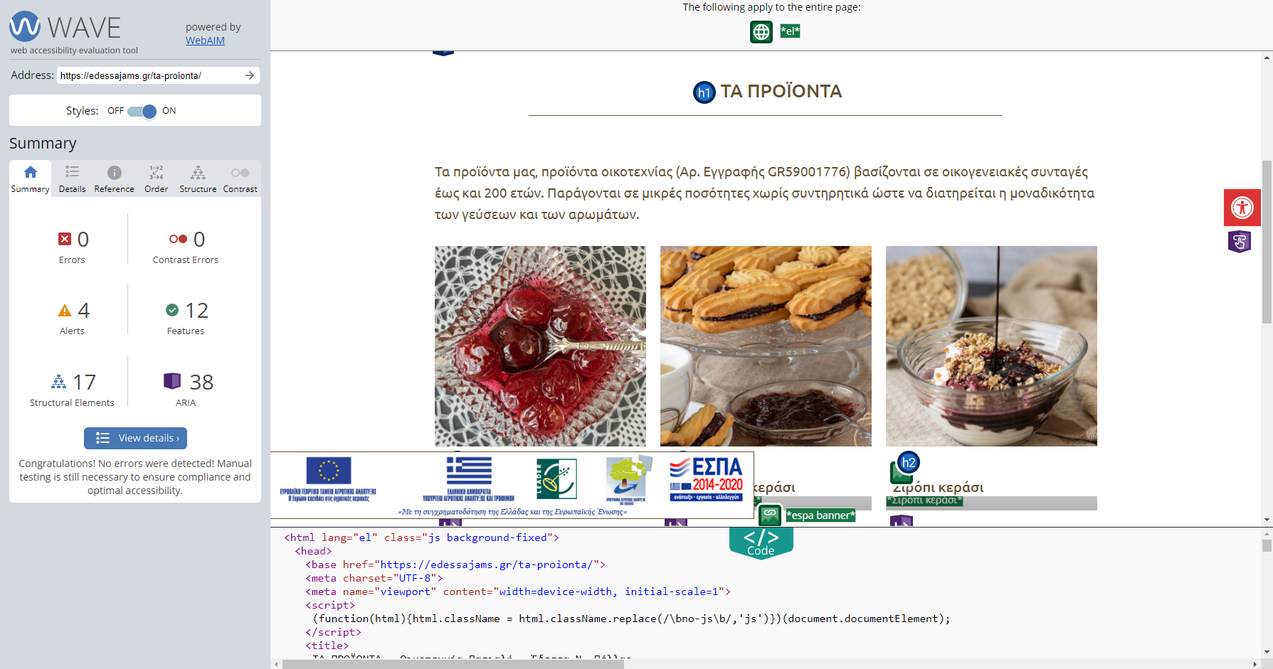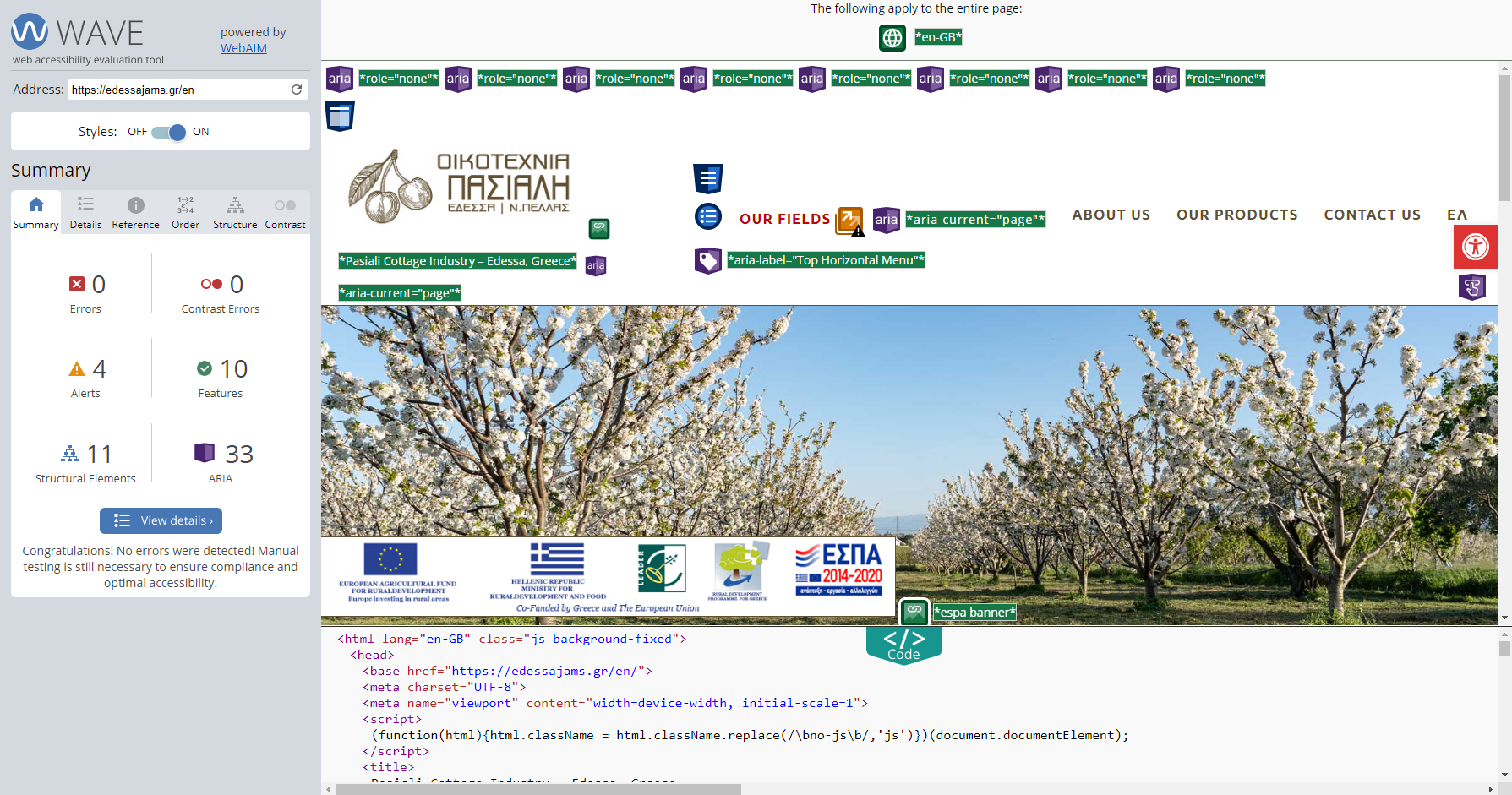 Ακολουθεί η επιτυχής αναφορά περί τήρησης προδιαγραφών ΑΜΕΑ, από το εργαλείο ελέγχου όπως αυτά περιγράφονται από τον οργανισμό W3C (http://www.w3.org/WAI/eval/preliminary.html) τα οποία αφορούν ελέγχους σχετικά με HTML & WCAG 2.0 AA.